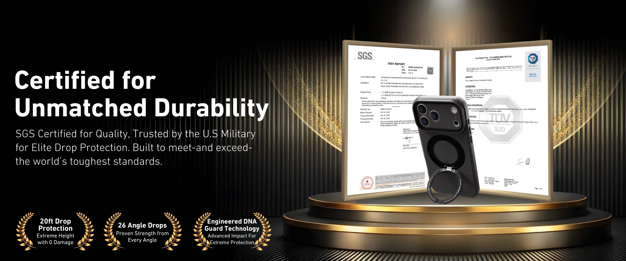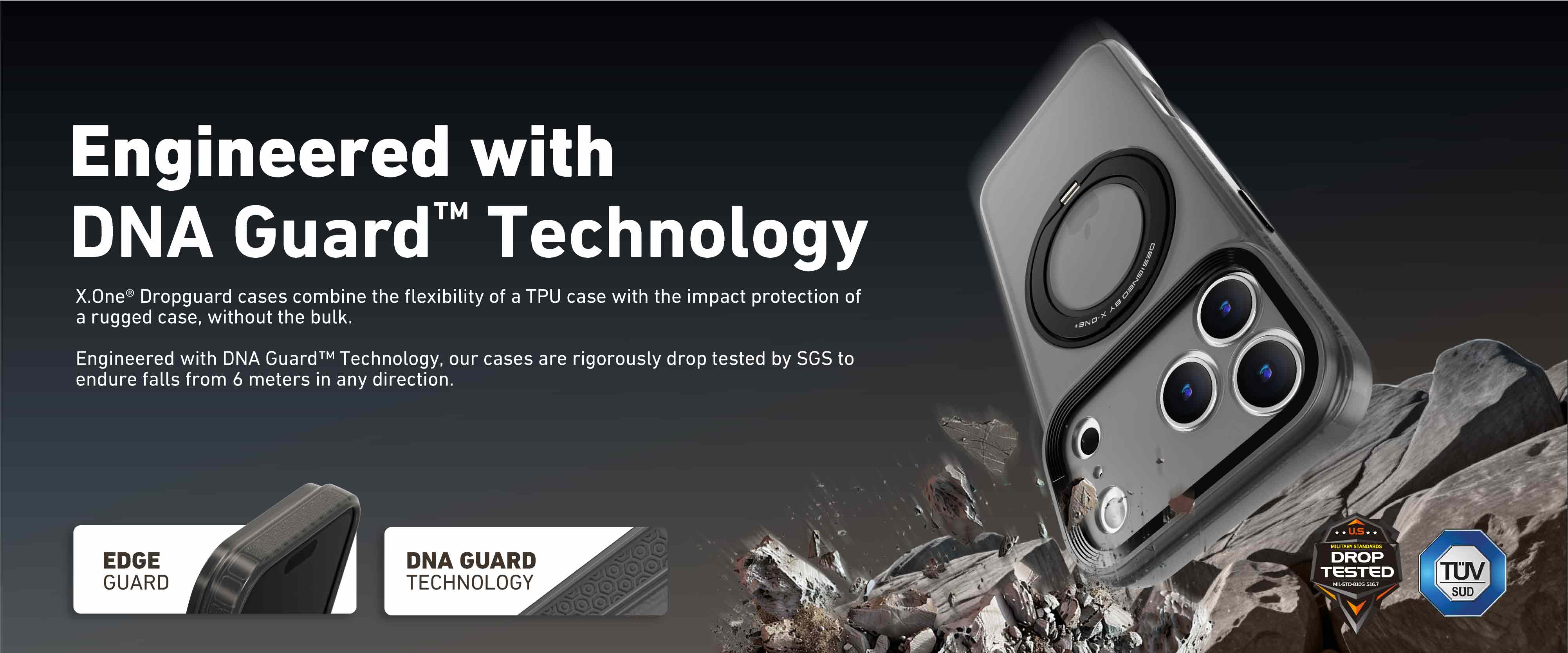 Introducing X.One Dropguard 2.0, rugged design case with advanced impact protection. Engineered with DNA Guard™ Technology, this case withstands drops from up to 20ft, rigorously tested and certified by TÜV and SGS.