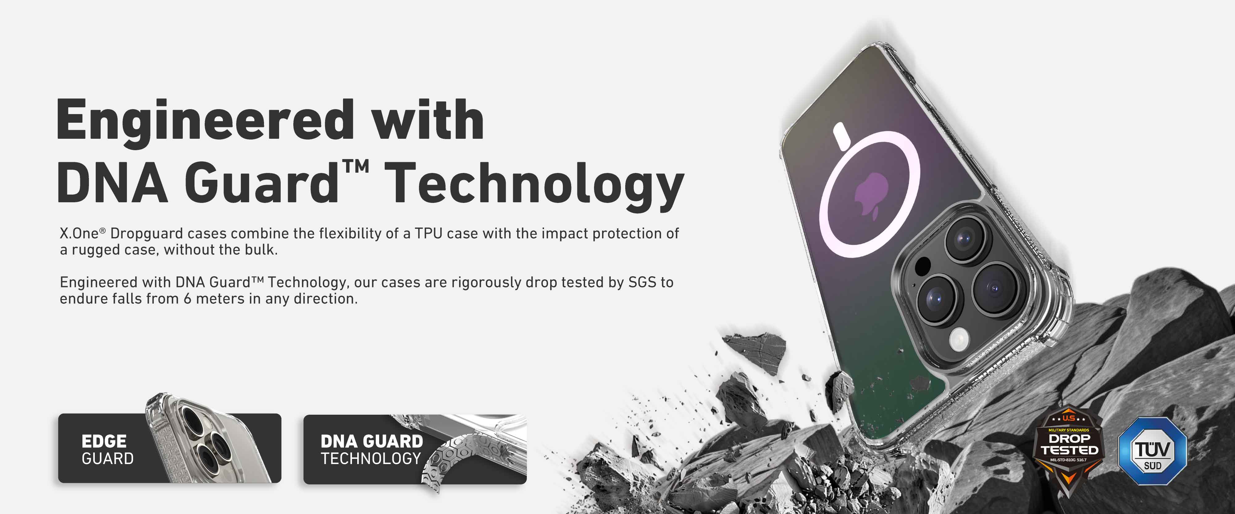 Introducing X.One Dropguard Pro, a fusion of advanced protection and slim design. Engineered with DNA Guard™ Technology, this case withstands drops from up to 20ft, rigorously tested and certified by TÜV and SGS. Its slim profile ensures it never feels bulky. Enjoy ultra yellowing resistant with EnduraClear™ Technology ensuring your case stays clear for longer period.