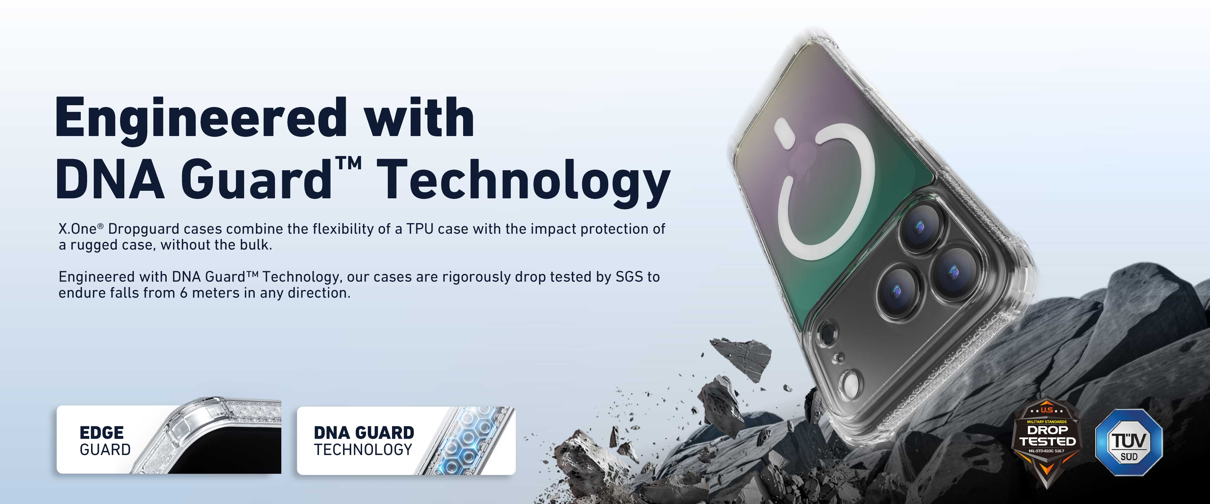 Introducing X.One Dropguard Pro, a fusion of advanced protection and slim design. Engineered with DNA Guard™ Technology, this case withstands drops from up to 20ft, rigorously tested and certified by TÜV and SGS. Its slim profile ensures it never feels bulky. Enjoy ultra yellowing resistant with EnduraClear™ Technology ensuring your case stays clear for longer period.